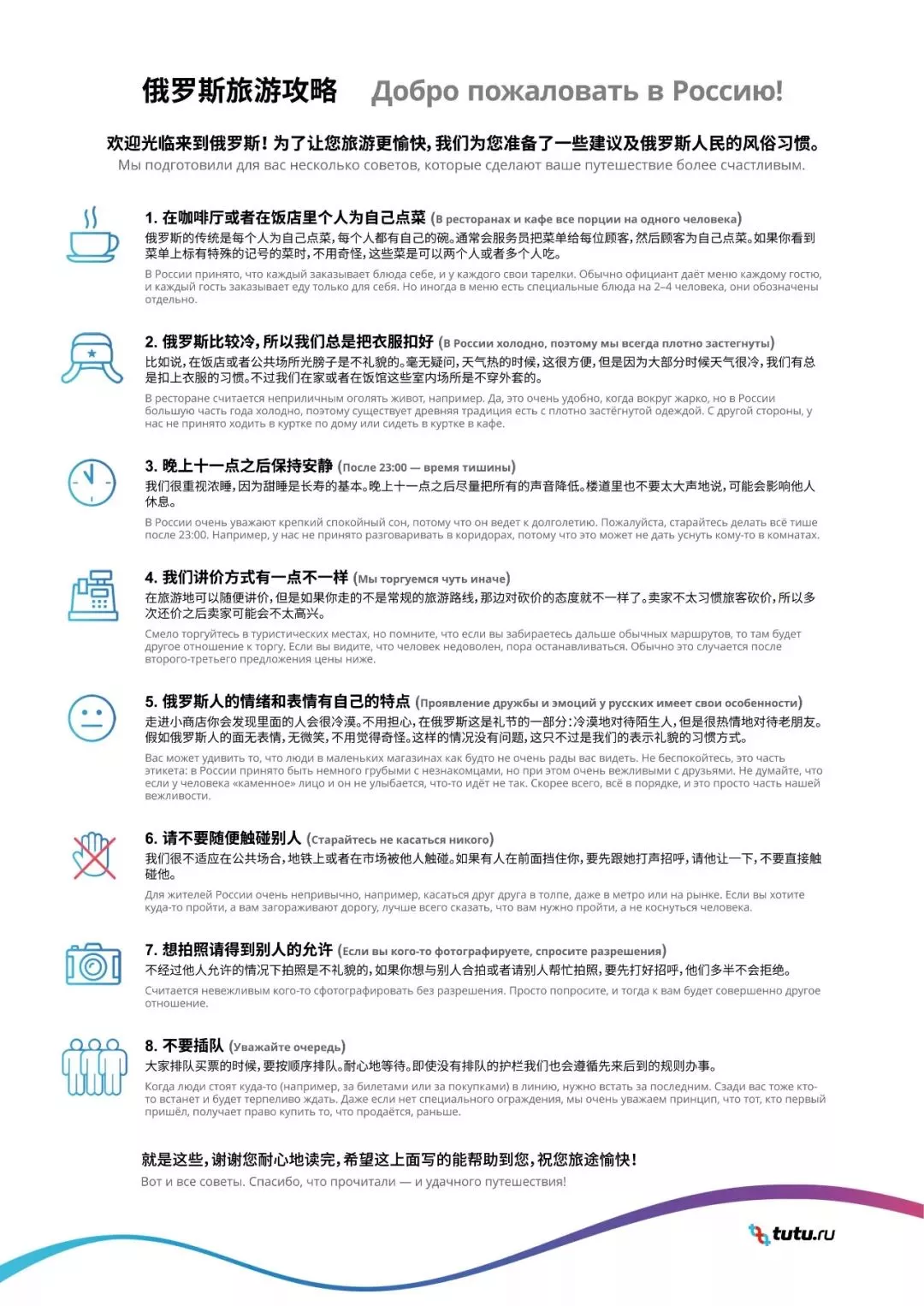 如今,俄罗斯已成为最受中国游客欢迎的旅游目的地之一,为了帮助更多的中国游客熟悉俄罗斯的风俗习惯,近日,俄罗斯旅游网站Tutu.ru专门制作了一份旅游指南,列出了8条建议,这份指南的前言是这样写的: